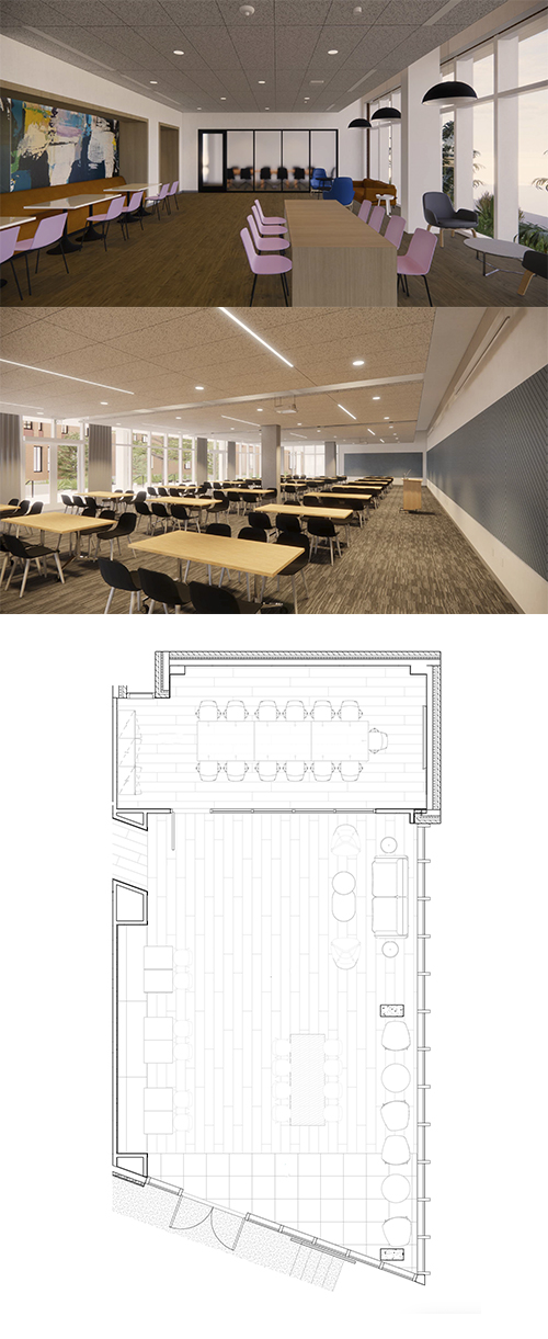 At the heart of the new res hall lies an expansive community center on the ground floor, offering 2,030 square feet of versatile space. With capacity for just over 200 guests, it will serve as a hub for events, meetings, and large gatherings. It will also provide ample room for studying and socializing. View full size images