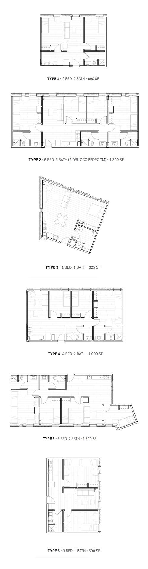 With apartment-style living for more than 600 students, the units include single and double rooms, ranging in size from one bed/one bath to six bed/three bath suites. Apartments feature large windows, exposed concrete walls, and modern laminate floors. View all layouts